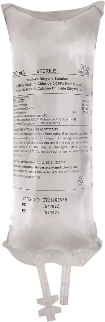 Neoflex Ringer's Solution 0.860% Sodium Chloride 0.030% Potassium Chloride 0.033% Calcium Chloride Dihydrate is used to replace extracellular fluid losses, to regulate the impaired sodium, potassium, calcium and chloride balance in the treatment of isotonic dehydration.